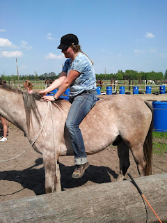 Kiedy przyjechałam tydzień później i warunki prezentowały się znacznie lepiej, wszystko wyglądało zupełnie inaczej. Na początku zaczęliśmy spokojnie, ponieważ na ujeżdżalni było sporo koni. Poza tym chcę wprowadzić do zabaw carrot sticka z flagą (torebką foliową zamiast savvy stringa) i mimo, że odczulałam już na nią Dżamala, okazało się, że nadal niezbyt jej ufa. Z tego, co widziałam, przyzwyczajenie go do tej nowej pomocy jeszcze chwilę zajmie. Później trochę się przeluźniło, więc postanowiłam podnieść nieco energię naszej zabawy. Zaczęliśmy robić okrążanie, Dżamal po chwili się rozkręcił i zaczęliśmy biegać. Polega to na tym, że robimy coś na kształt wędrującego okrążania, z tym, że on co jakiś czas zaczyna przyspieszać, galopować, zazwyczaj bardziej w linii prostej niż po okręgu, więc wtedy ja biegnę za nim, starając się nie napinać liny bez potrzeby, nakierowuję go na jakąś przeszkodę terenową, żeby zamiast biec bezmyślnie musiał coś ominąć/przeskoczyć, potem zmieniam kierunek, Dżamal strzela kila baranków, znów galopuje. Często zmienia kierunek z własnej inicjatywy, wtedy stosuję zasadę "ja też!", czyli daję mu sygnał do jeszcze szybszego biegu. Podoba mi się to, że zazwyczaj, kiedy wbiegnie za jakąś tyczkę/słupek i poczuje napór liny, zatrzymuje się i zadaje mi pytanie. Wtedy proszę go o ruch w drugą stronę, żeby nie zaplątywać liny w słupek. Czuję wtedy, że to zabawa, a nie dzikie bieganie bez kontroli, ponieważ mój koń zachowuje się jak partner.